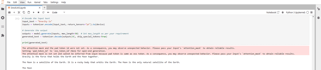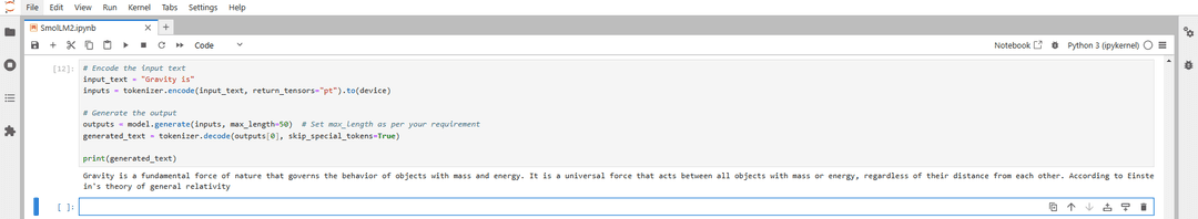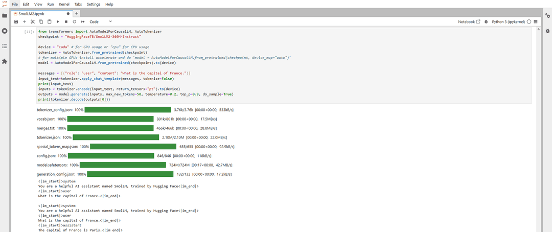 Run the following code in the Jupyter Notebook cell to load the SmolLM2-135M model and generate output: