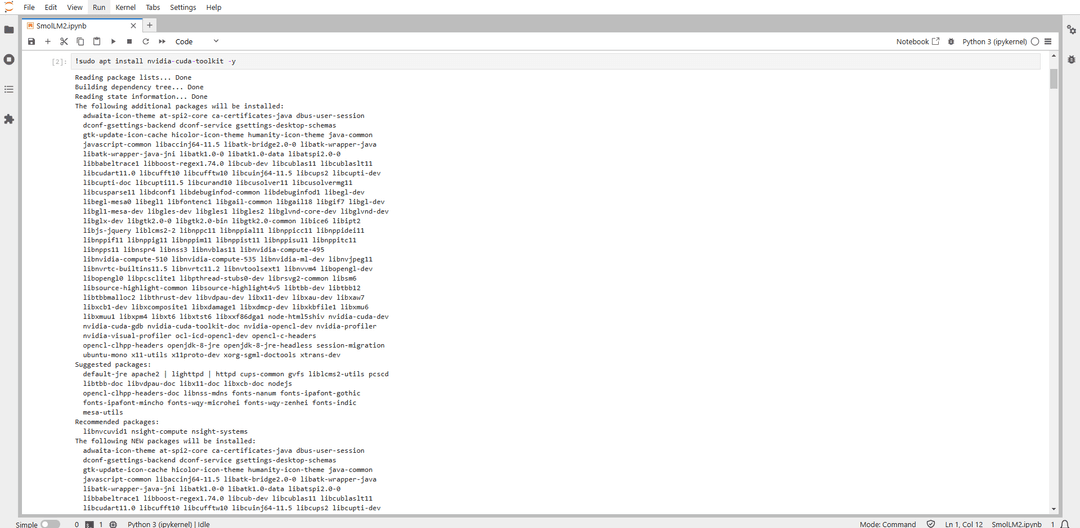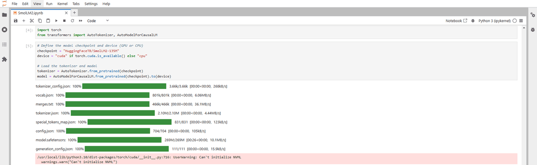 Next, run the following code in the Jupyter Notebook cell to load the SmolLM2-135M model:
