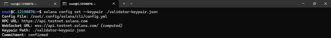 The command below sets the validator keypair you just created as the default one in the Solana configuration, allowing the Solana CLI or subsequent commands to use it for authentication and other purposes: