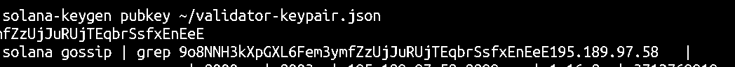 Next, you can verify that your validator is running correctly by checking if it has registered with the Gossip network. In a new terminal, SSH to your remote server, log in as the “sol” user, and extract the public key which will be used to identify your validator node on the Solana network from the validator-keypair.json