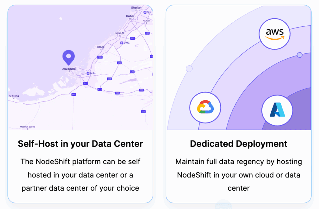 The solution many teams are now turning to is on-premise GenAI, AI that runs fully inside their own servers or their own private cloud. This gives them the power of AI without sending any data out. All GenAI processing with NodeShift AI happens within your own firewalled network; no data, prompts, embeddings, or logs ever leave your servers. This meets strict residency requirements similar to those followed, especially in GCC countries like Saudi Arabia, UAE, Qatar, Bahrain, Oman, and Kuwait, with strict Data residency laws.