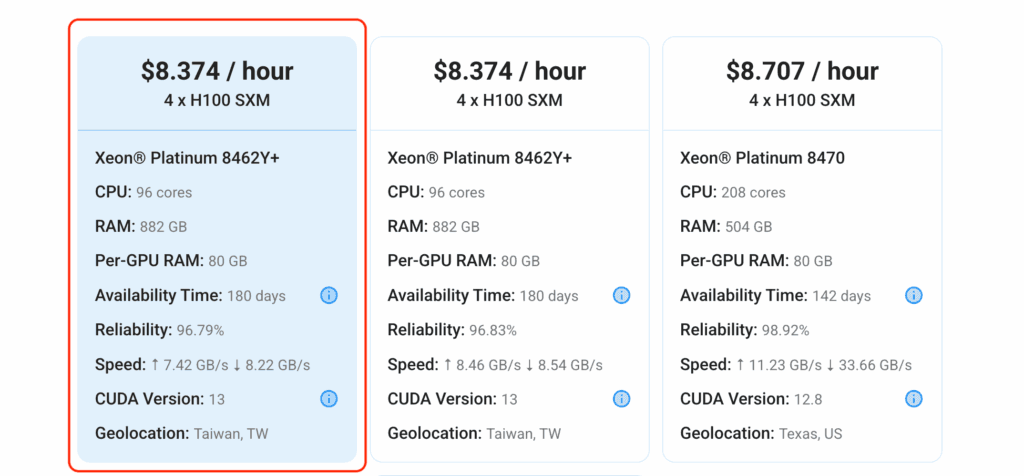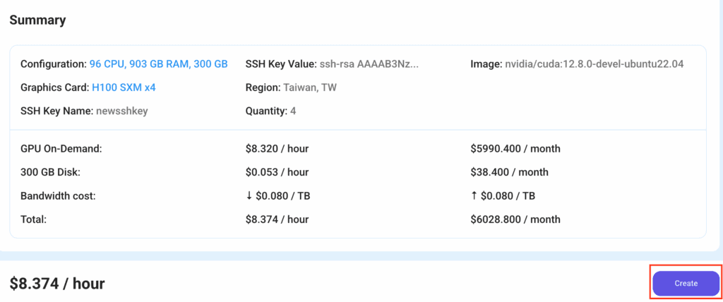 - After selecting your required configuration options, you’ll see the available GPU nodes in your region and according to (or very close to) your configuration. In our case, we’ll choose a 4x H100 80GB GPU node with 96 vCPUs/882 GB RAM/300GB SSD.