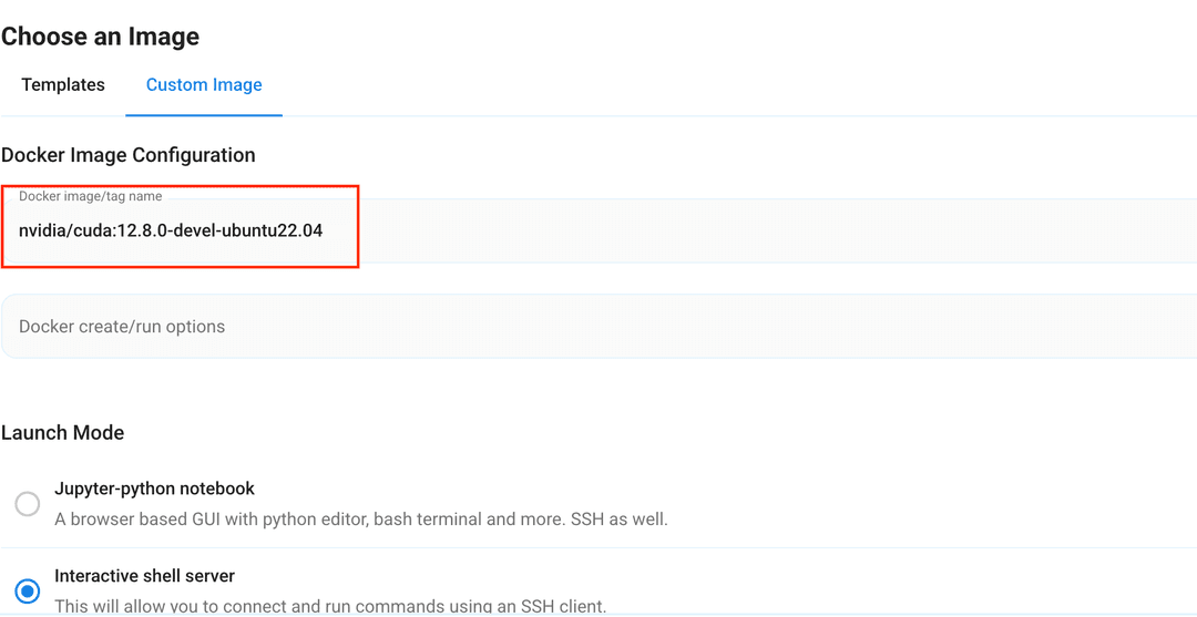 In our previous blogs, we used pre-built images from the Templates tab when creating a Virtual Machine. However, for running a CUDA dependent model like HunyuanImage-2.1, we need a latest CUDA version like CUDA12.4. Therefore, in this case, we switched to the Custom Image tab and selected a specific Docker image that meets all runtime and compatibility requirements.