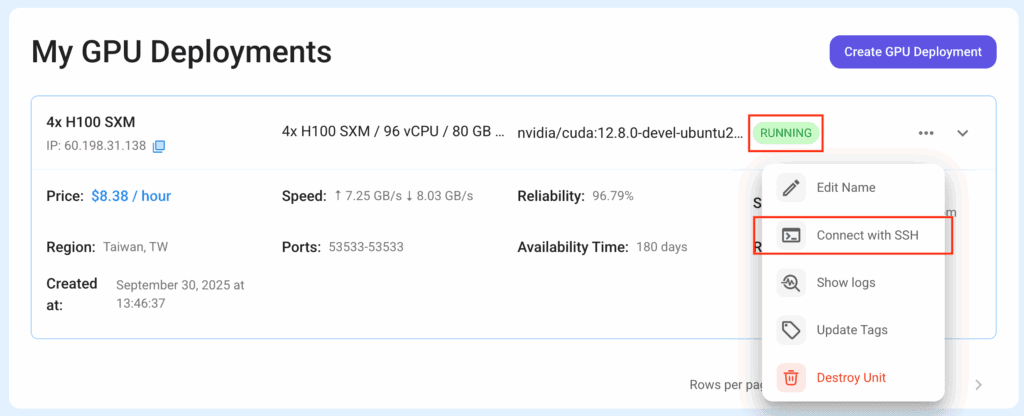 - Once your GPU shows this status, navigate to the three dots on the right, click on Connect with SSH, and copy the SSH details that appear.