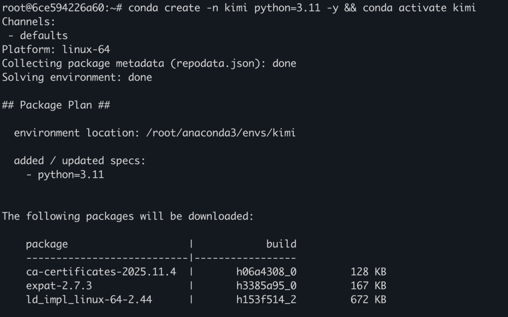 conda create -n kimi python=3.11 -y && conda activate kimi