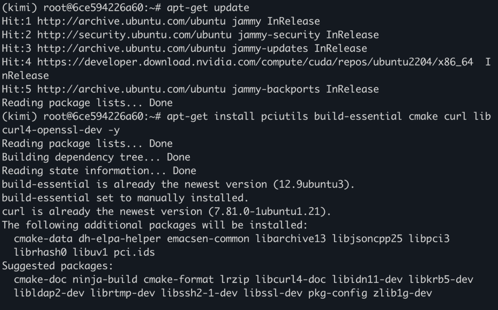 2. Once inside the environment, update the Ubuntu package source-list for fetching the latest repository updates and patches. Then install dependencies for llama.cpp.