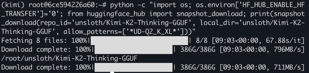 python -c "import os; os.environ['HF_HUB_ENABLE_HF_TRANSFER']='0'; from huggingface_hub import snapshot_download; print(snapshot_download(repo_id='unsloth/Kimi-K2-Thinking-GGUF', local_dir='unsloth/Kimi-K2-Thinking-GGUF', allow_patterns=['*UD-Q2_K_XL*']))"