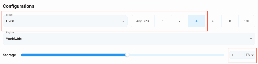 Step 3: Selecting configuration for GPU (model, region, storage)