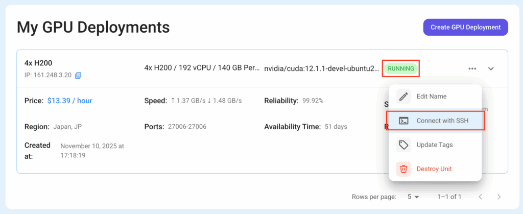 - Once your GPU shows this status, navigate to the three dots on the right, click on Connect with SSH, and copy the SSH details that appear.