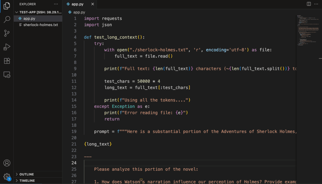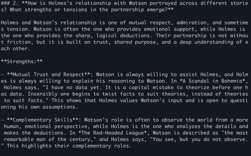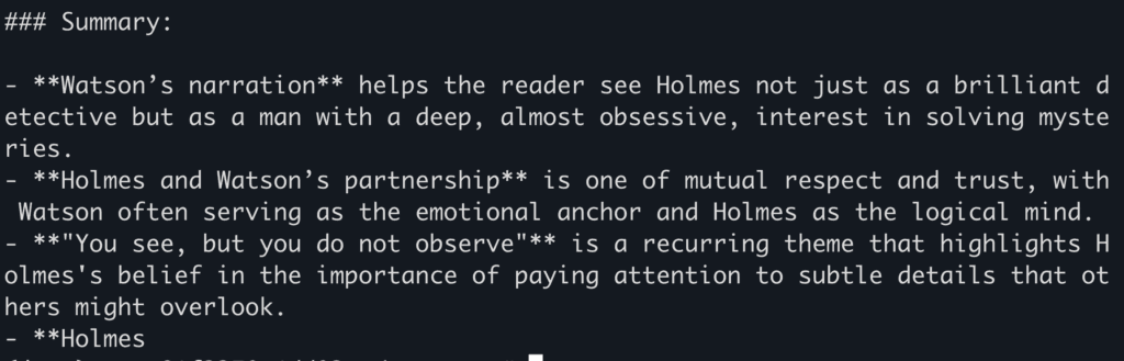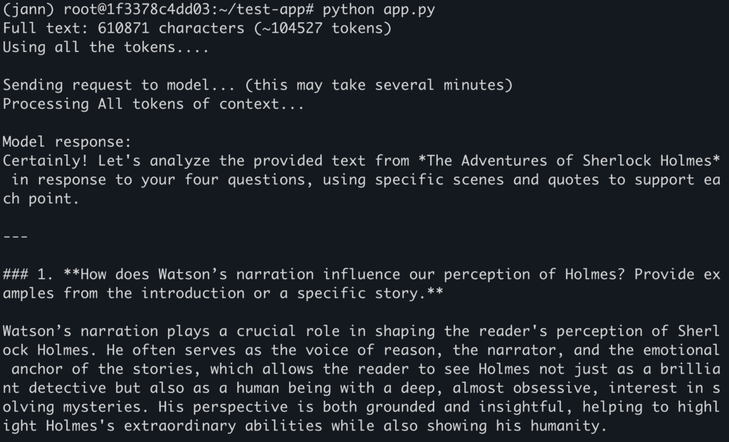 This is just a test script that tests the model’s long context capabilities on a very long context i.e., the novel “The Adventures of Sherlock Holmes” in the form of text file. Further we ask the model some deep questions from different areas of this novel.