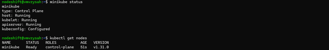 Run the following command to check the status of Minikube and your Kubernetes cluster: