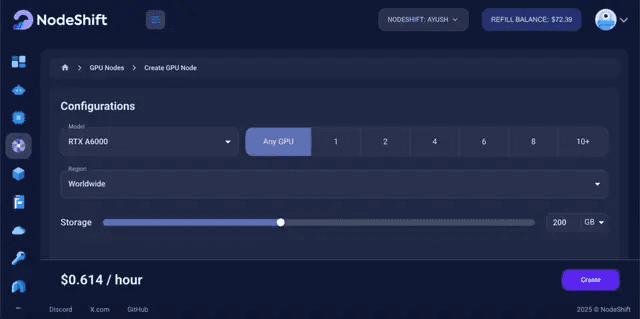 GPU Nodes are NodeShift’s GPU Virtual Machines, on-demand resources equipped with diverse GPUs ranging from H100s to A100s. These GPU-powered VMs provide enhanced environmental control, allowing configuration adjustments for GPUs, CPUs, RAM, and Storage based on specific requirements.