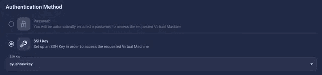 There are two authentication methods available: Password and SSH Key. SSH keys are a more secure option. To create them, please refer to our official documentation.