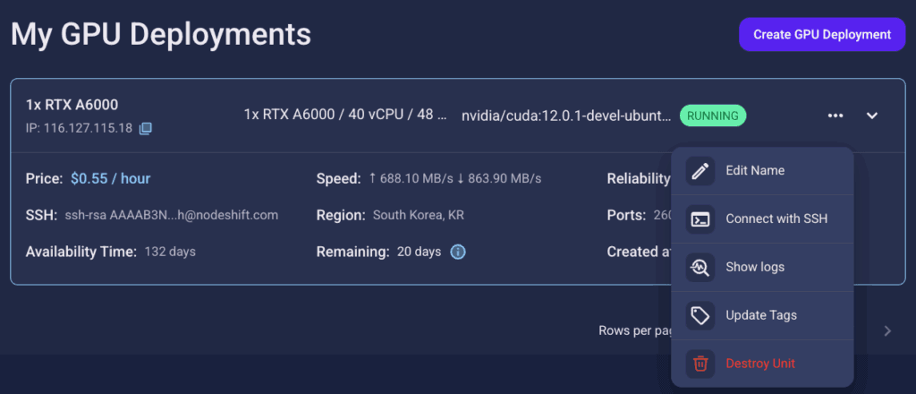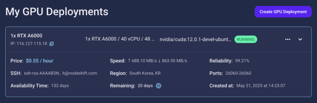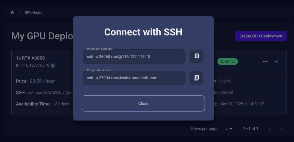 NodeShift GPUs can be connected to and controlled through a terminal using the SSH key provided during GPU creation.