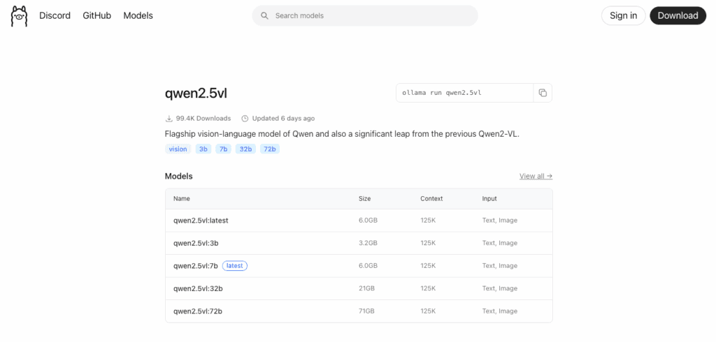 | qwen2.5vl:latest | 6.0 GB | Text, Image | 125K | Same as 7B | Same as 7B | 8+ | 16 GB | 32 GB+ |