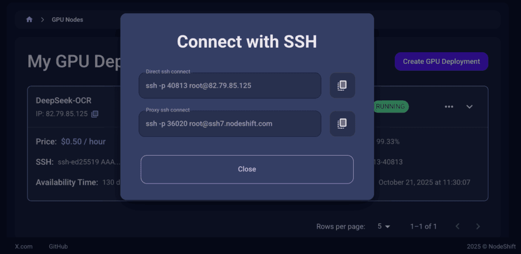 This gives us SSH access and full control over terminal operations — perfect for installing dependencies, running benchmarks, and launching models like DeepSeek-OCR.
