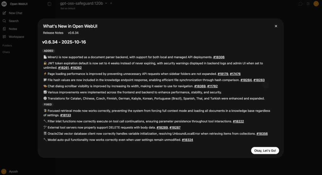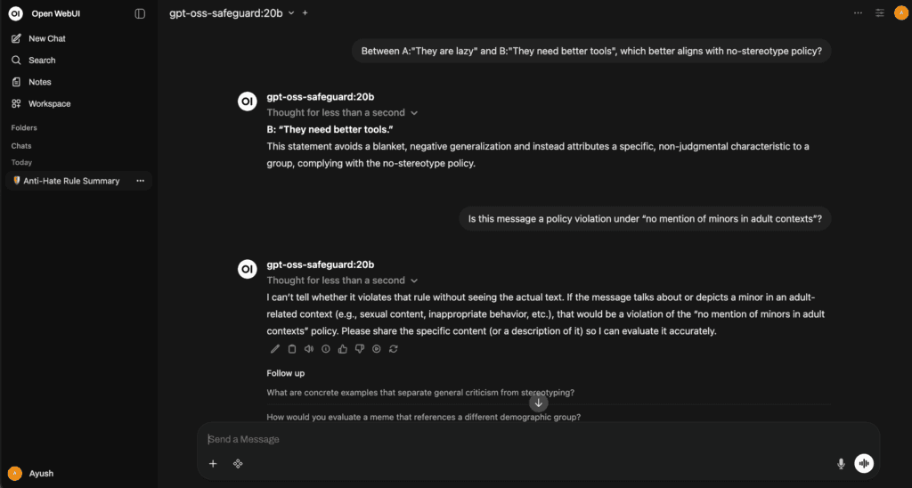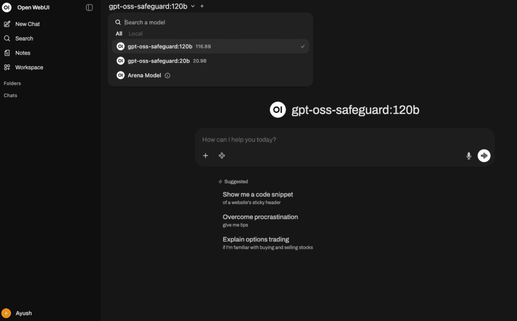 Now you’ve successfully run and interacted with the GPT-OSS-Safeguard 20B and 120B models directly in your terminal using Ollama! This command-line approach is fast and powerful for quick experiments or automation. However, sometimes you want a more visually appealing and user-friendly interface for chatting with models, exploring outputs, or showcasing demos. For those moments, it’s great to use an interface like Open WebUI, which makes running prompts and interacting with models both simple and enjoyable. In the next steps, we’ll see how to run the same models with Open WebUI and experience an upgraded, interactive chat environment.