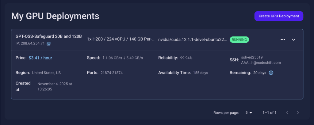 This setup ensures that the GPT-OSS-Safeguard 20B and 120B runs in a GPU-enabled environment with proper CUDA access and high compute performance.