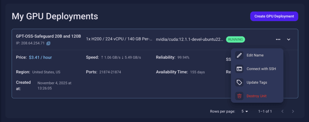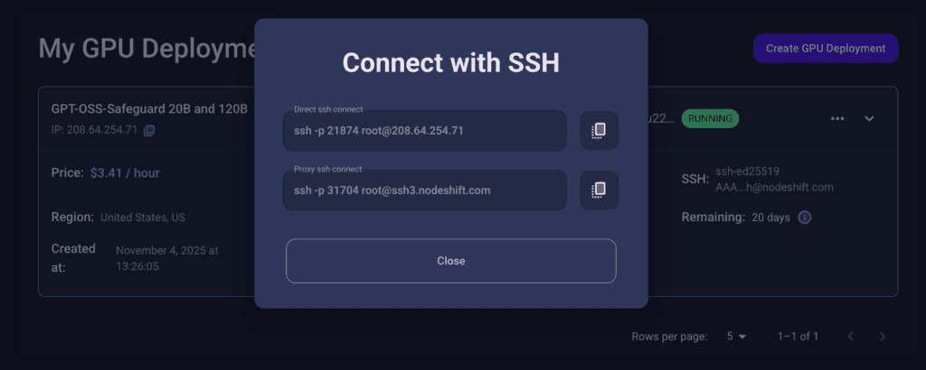 This gives us SSH access and full control over terminal operations — perfect for installing dependencies, running benchmarks, and launching tools like GPT-OSS-Safeguard 20B and 120B.