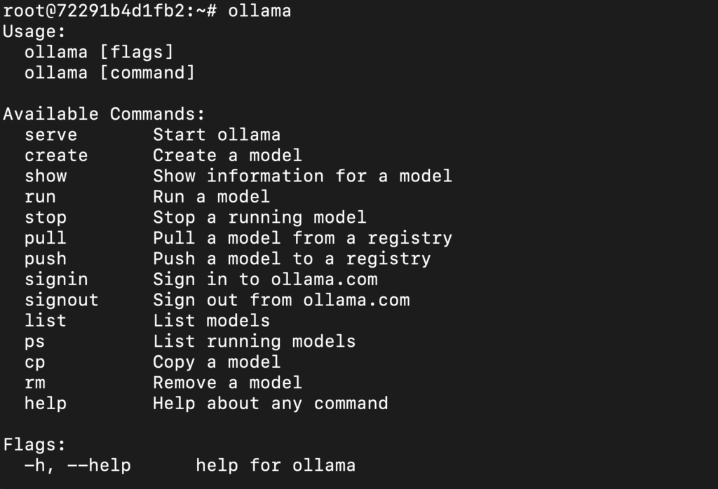 This command helps you quickly understand what you can do with Ollama—such as running, pulling, stopping models, and more.