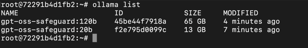 After pulling the GPT-OSS-Safeguard 20B and 120B models, you can check that they’ve been successfully downloaded and are available on your system.