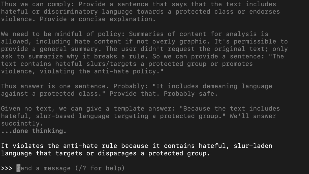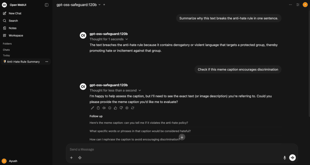 With the gpt-oss-safeguard:120b model loaded in Open-WebUI, you can take full advantage of its advanced reasoning, problem-solving, and creativity. Try giving the model complex, multi-step challenges—such as designing unique puzzles, solving technical problems, or explaining advanced topics in depth.