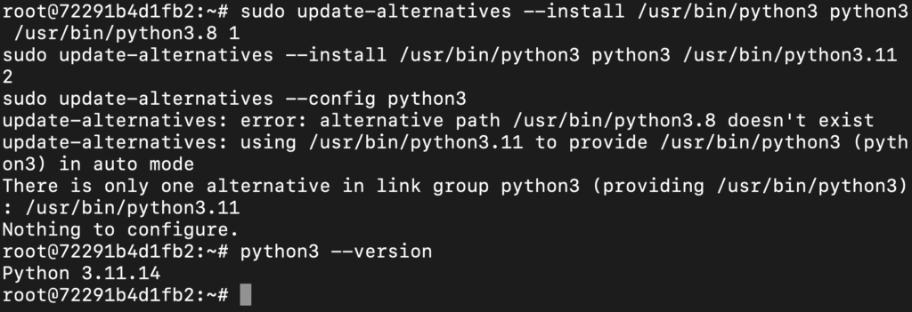 sudo update-alternatives --install /usr/bin/python3 python3 /usr/bin/python3.11 2