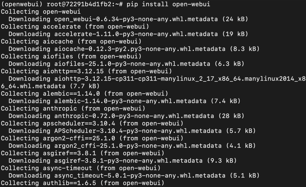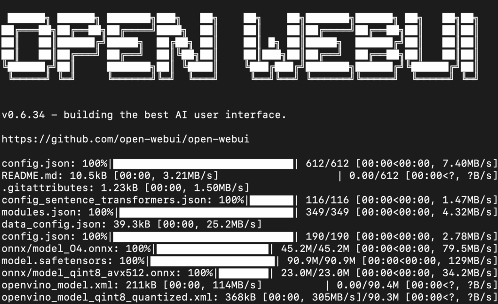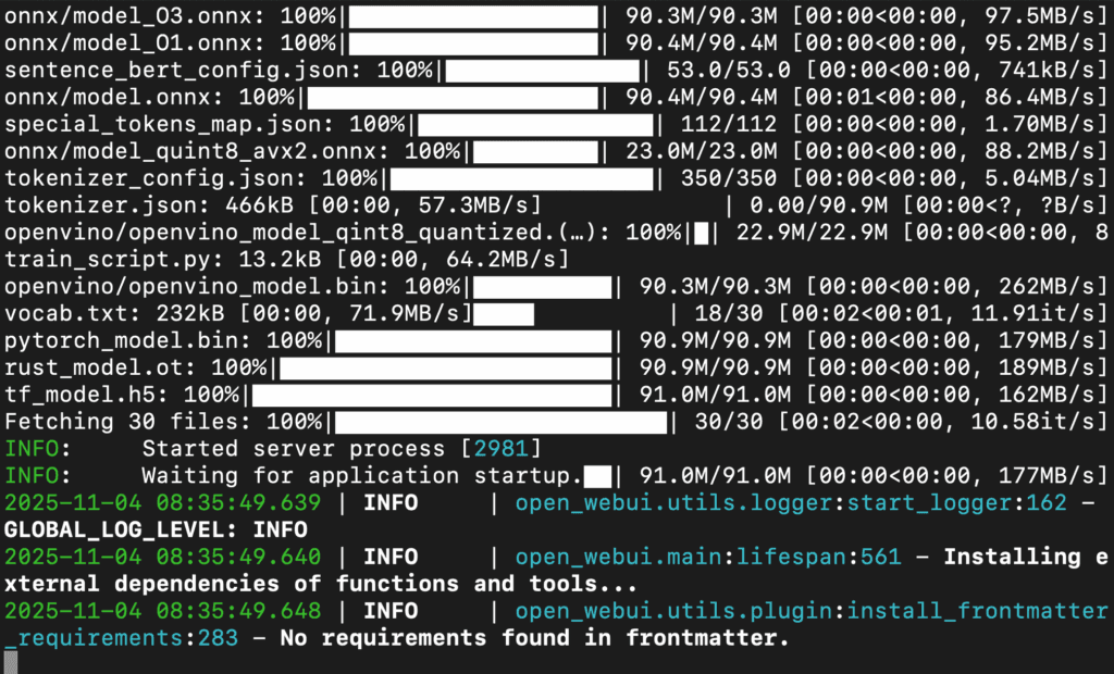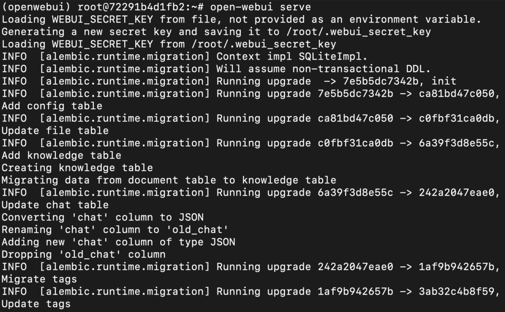 - Wait for the server to complete all database migrations and set up initial files. You’ll see a series of INFO logs and a large “OPEN WEBUI” banner in the terminal.