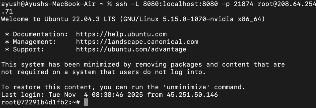 ssh -L 8080:localhost:8080 -p 18685 root@Your_VM_IP