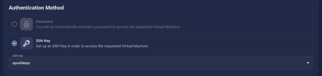 There are two authentication methods available: Password and SSH Key. SSH keys are a more secure option. To create them, please refer to our official documentation.