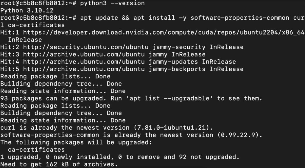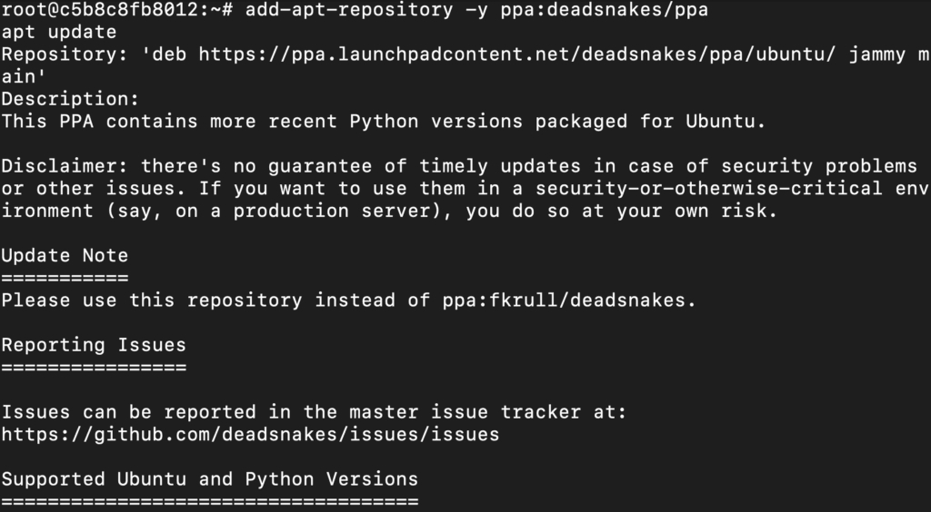 If you check the version of the python, system has Python 3.10.12 available by default. To install a higher version of Python, you’ll need to use the deadsnakes