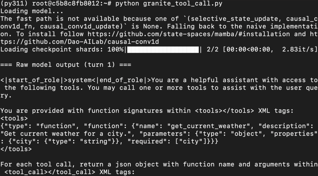 - Builds a one-turn chat + tools list using Granite’s chat template, then generates a first reply expecting a