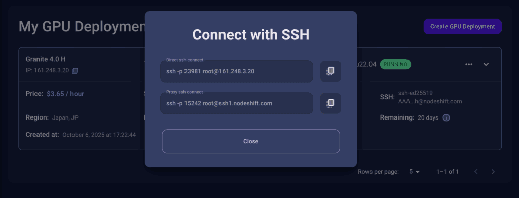 This gives us SSH access and full control over terminal operations — perfect for installing dependencies, running benchmarks, and launching tools like IBM Granite 4.0 H Tiny, Small and Micro.