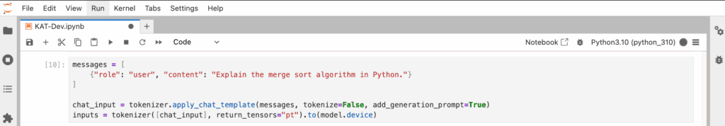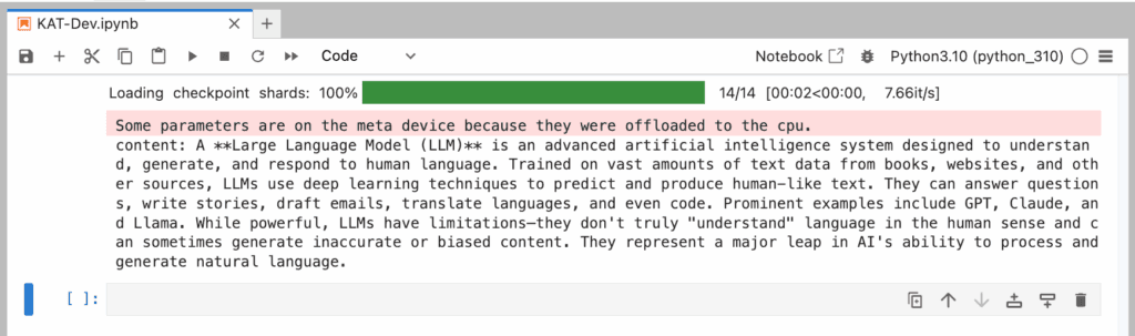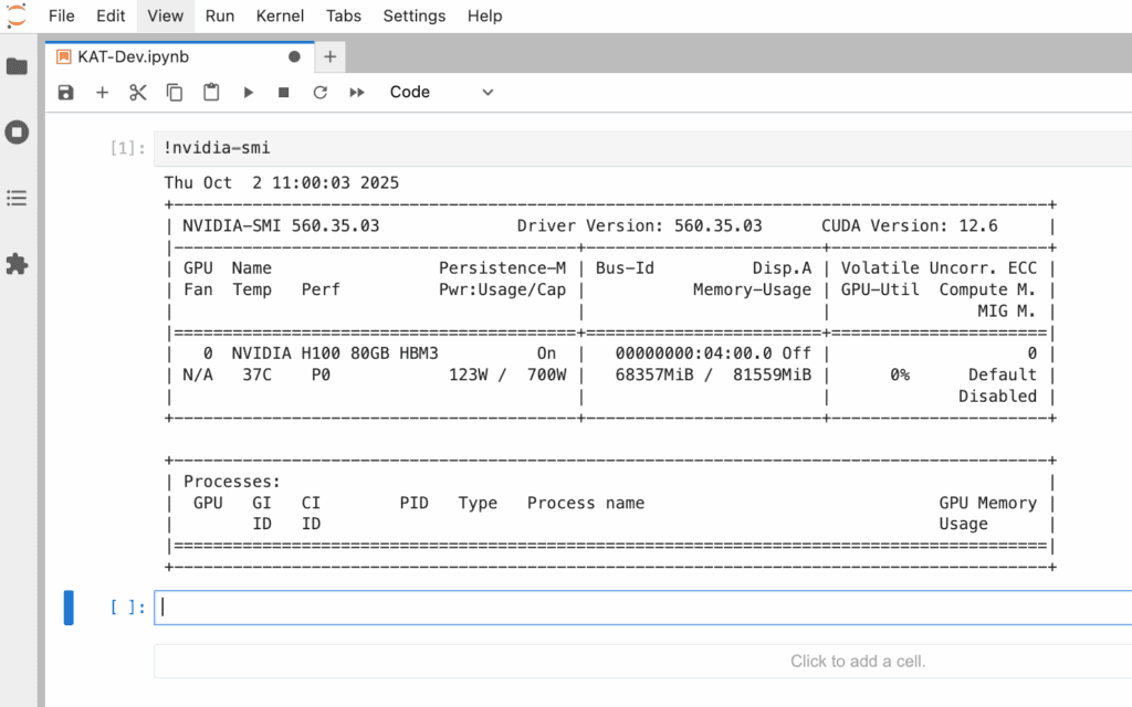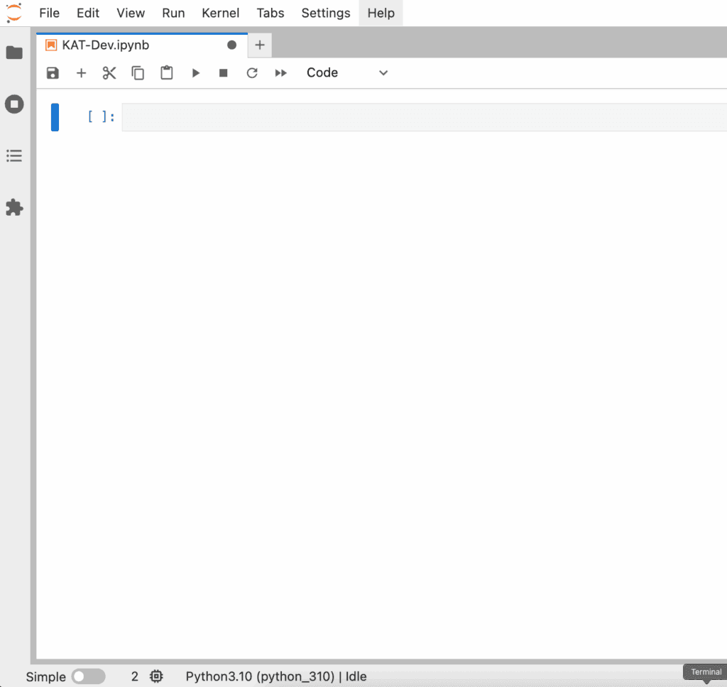 - You should now see an empty notebook named KAT-Dev.ipynb with a code cell ready.