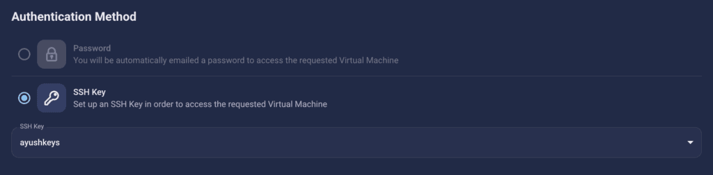 There are two authentication methods available: Password and SSH Key. SSH keys are a more secure option. To create them, please refer to our official documentation.
