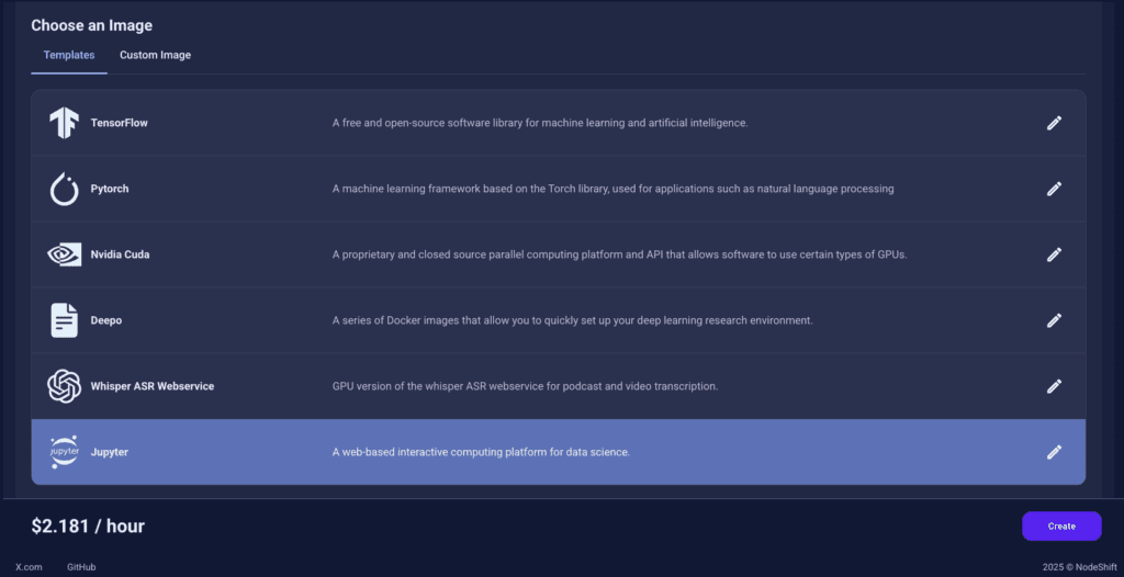 We’ll use the Jupyter image from NodeShift’s gallery so you don’t have to install Jupyter Notebook/Lab manually. This image is GPU-ready and comes with a preconfigured Python + Jupyter environment—perfect for testing and serving KAT-Dev.