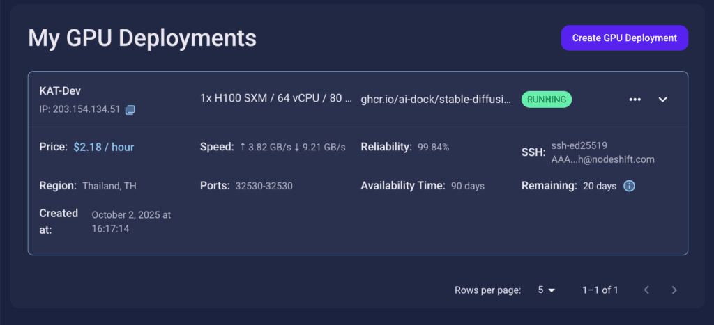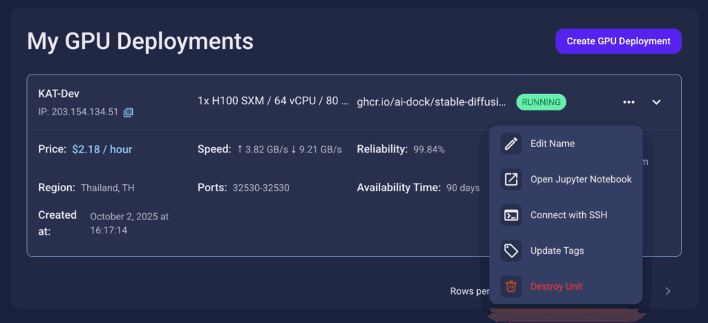 Once your GPU VM is in the RUNNING state, you’ll see a control menu (three dots on the right side of the deployment card). This menu gives you multiple ways to access and manage your deployment.