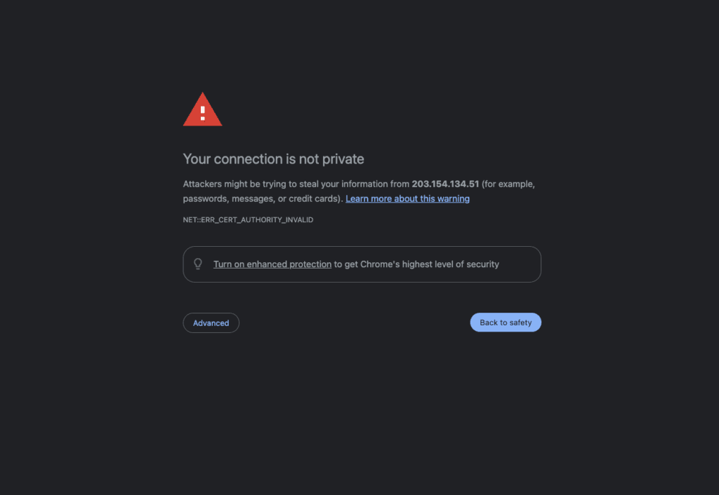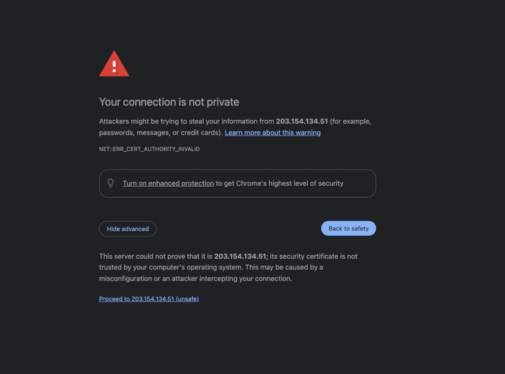 Since the Jupyter server is running with a self-signed SSL certificate, your browser may show a “Your connection is not private” warning.