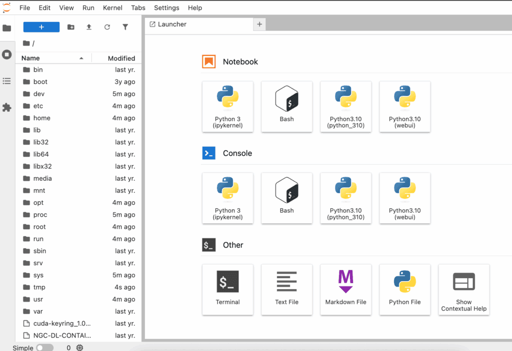 Now that JupyterLab is running, let’s create a notebook where we will set up and run KAT-Dev.