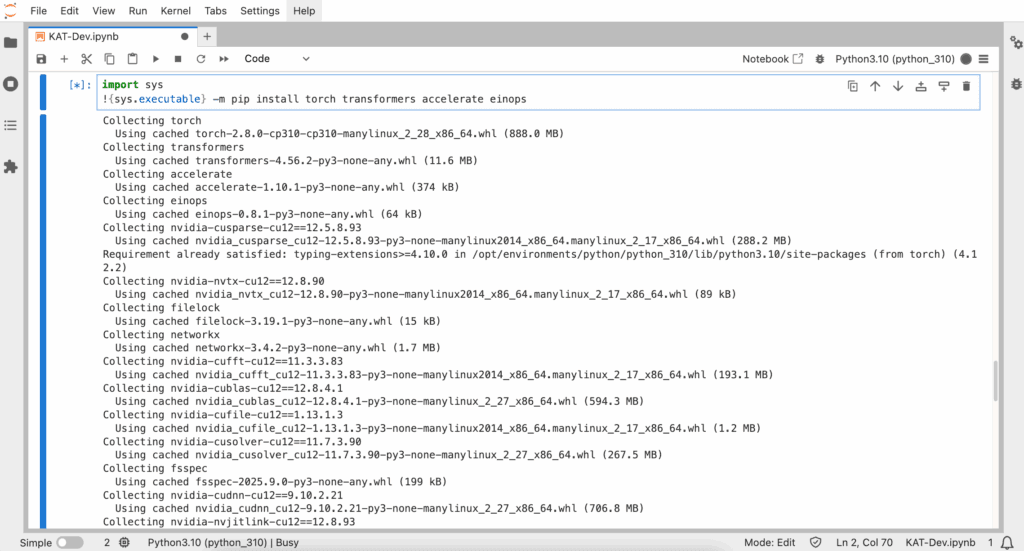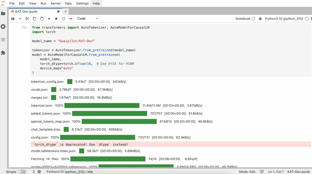These packages are essential to load and run Kwaipilot/KAT‑Dev‑32B inside a Jupyter Notebook.