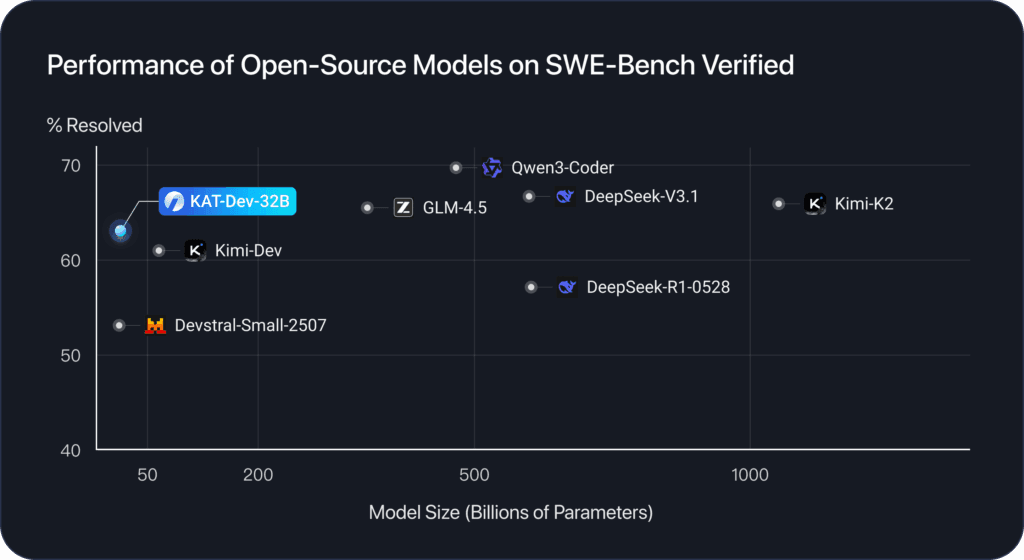 KAT-Dev-32B (Kwaipilot/KAT-Dev) is a 32.8B-parameter coding assistant based on Qwen3-32B, purpose-tuned for software engineering. It’s trained in three phases—mid-training (core skills), SFT + RFT (curated tasks with teacher trajectories), and large-scale agentic RL (prefix caching + trajectory pruning + scalable infra). On SWE-Bench Verified, it reports 62.4% resolved, placing it among the strongest open-source code models at its scale. It supports HF Transformers and vLLM, uses a Qwen-style chat template, and is well-suited for repo-level reasoning, tool use, and multi-turn debugging.