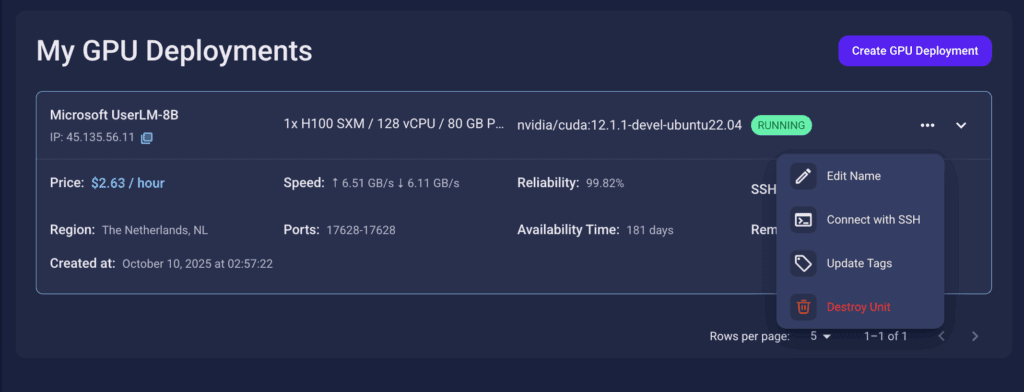 This gives us SSH access and full control over terminal operations — perfect for installing dependencies, running benchmarks, and launching models like Microsoft UserLM-8B.