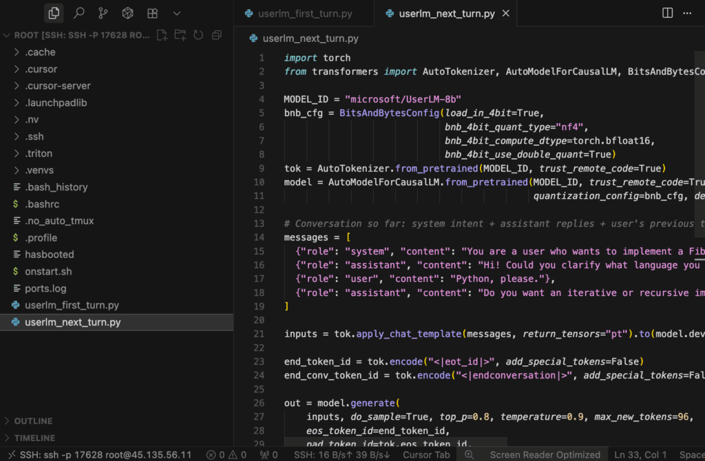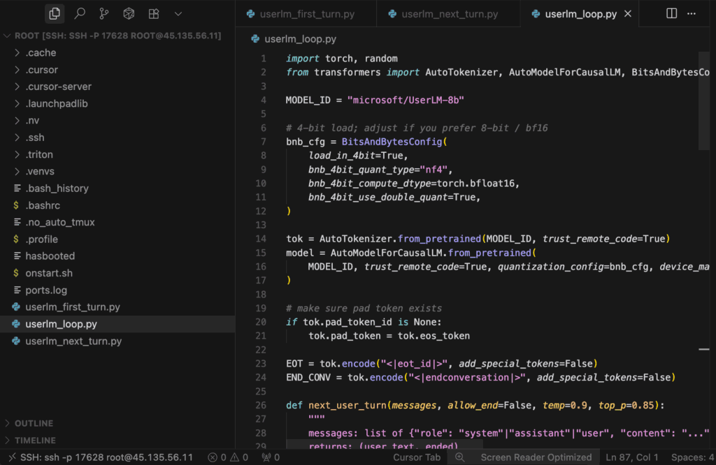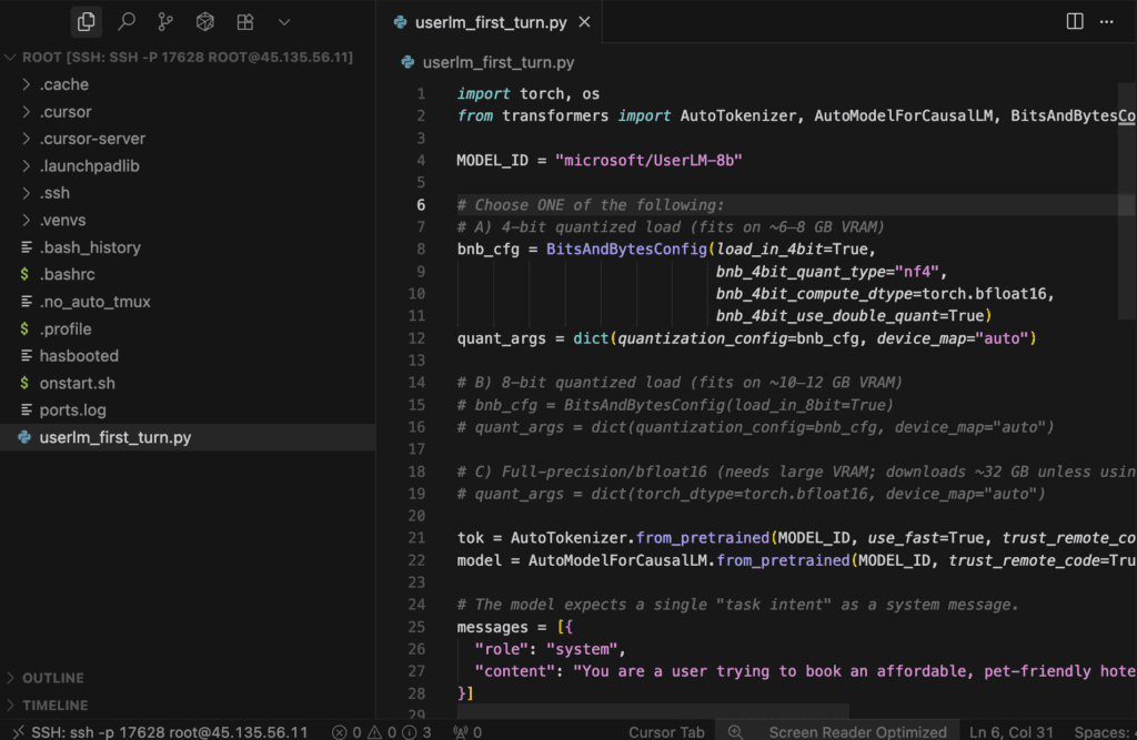 Before you start running model script with the Microsoft UserLM-8B model, it’s a good idea to connect your GPU virtual machine (VM) to a code editor of your choice. This makes writing, editing, and running code much easier.