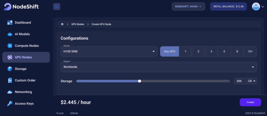 GPU Nodes are NodeShift’s GPU Virtual Machines, on-demand resources equipped with diverse GPUs ranging from H200s to A100s. These GPU-powered VMs provide enhanced environmental control, allowing configuration adjustments for GPUs, CPUs, RAM, and Storage based on specific requirements.