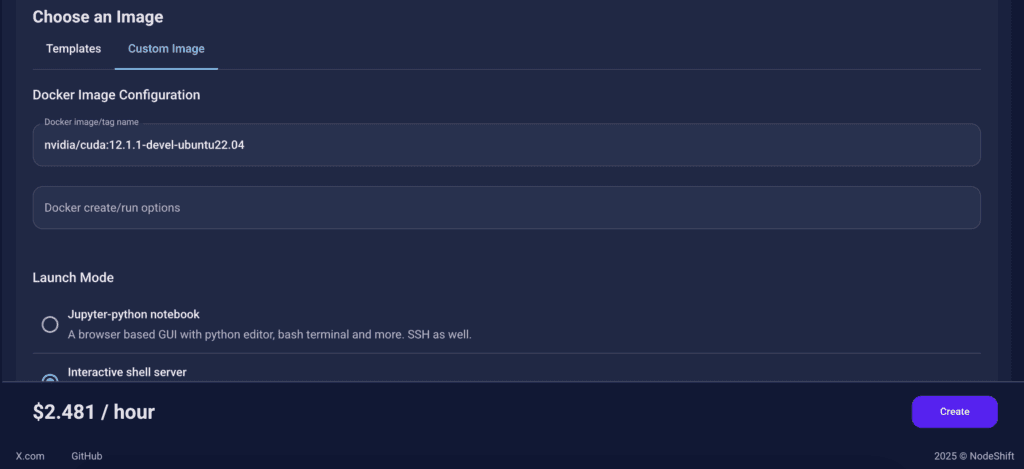 In our previous blogs, we used pre-built images from the Templates tab when creating a Virtual Machine. However, for running OlmOCR-2-7B-1025-FP8, we need a more customized environment with full CUDA development capabilities. That’s why, in this case, we switched to the Custom Image tab and selected a specific Docker image that meets all runtime and compatibility requirements.