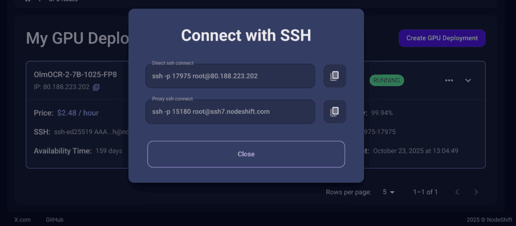 This gives us SSH access and full control over terminal operations — perfect for installing dependencies, running benchmarks, and launching models like OlmOCR-2-7B-1025-FP8.