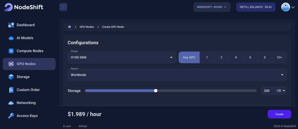 GPU Nodes are NodeShift’s GPU Virtual Machines, on-demand resources equipped with diverse GPUs ranging from H200s to A100s. These GPU-powered VMs provide enhanced environmental control, allowing configuration adjustments for GPUs, CPUs, RAM, and Storage based on specific requirements.