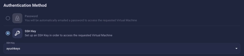 There are two authentication methods available: Password and SSH Key. SSH keys are a more secure option. To create them, please refer to our official documentation.