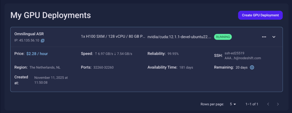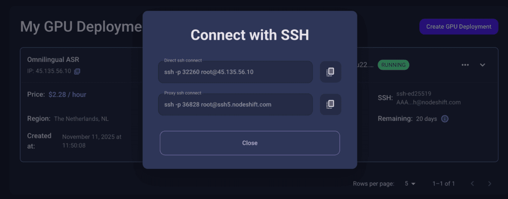 This gives us SSH access and full control over terminal operations — perfect for installing dependencies, running benchmarks, and launching models like Omnilingual ASR.