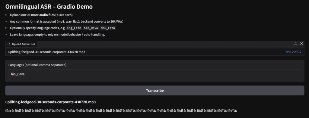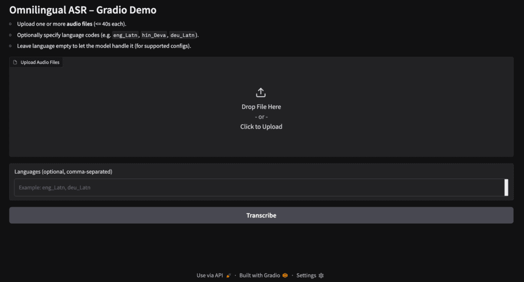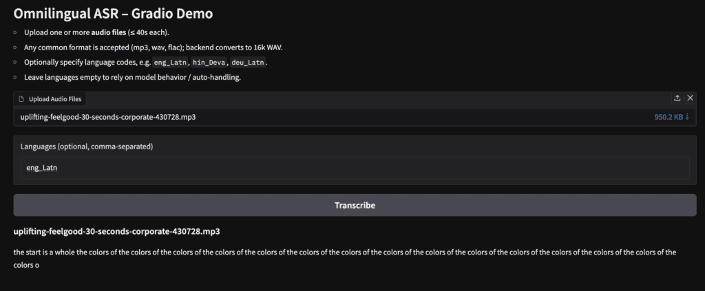 - Provides a web UI: Uses Gradio to create a browser interface where users upload audio and instantly see transcribed text results.